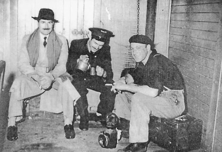 1945. Luis (de impermeable) viaja en un vagón, junto a dos compañeros ferroviarios