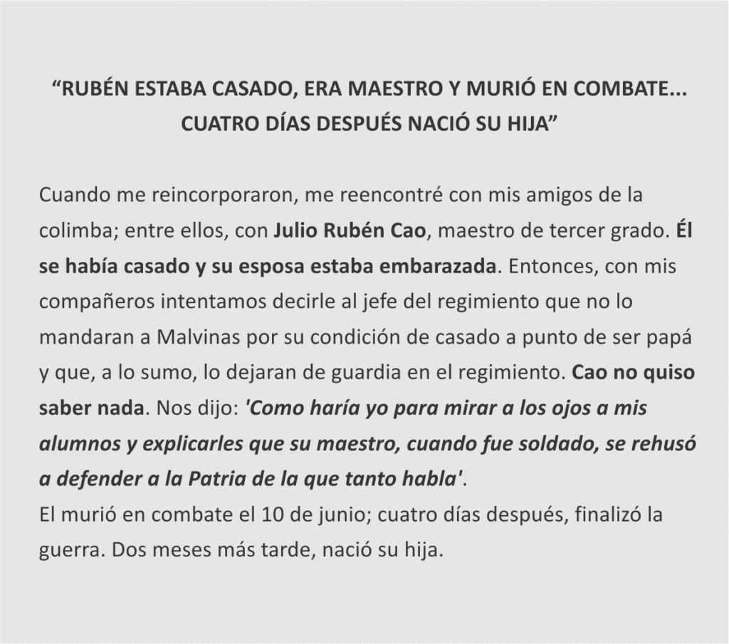 En una guerra es inevitable ver la grandeza y la miseria de los hombres… el ejemplo del maestro Cao (recuadro); ver un sargento que no comía hasta que la tropa estuviera alimentada; ver otro suboficial que cuando se firma la rendición entierra una bandera argentina en un lugar que el sólo conoce; el soldado Vischuk que enojado ante un ataque aéreo, salió de su refugio y empezó a tirarle a los aviones sin protección alguna… la miseria de la destrucción de la gente, comprobar dolorosamente la fragilidad del cuerpo… la pérdida de un brazo, de una pierna… imágenes que no se borran.