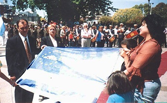 Aquella mañana de primavera, en el marco del 46° aniversario del nacimiento de Tres de Febrero, la nueva bandera ingresó a la plaza llevada por su creador, Sergio García, acompañado por su esposa Livia y sus tres hijos: Micaela, Juan Manuel y Malena (foto). Mientras avanzaban entre los aplausos de autoridades municipales, entidades intermedias, delegaciones escolares y vecinos, una lluvia de papelitos celestes y blancos cubría el cielo, al compás de la marcha interpretada por la Banda del Colegio Militar.